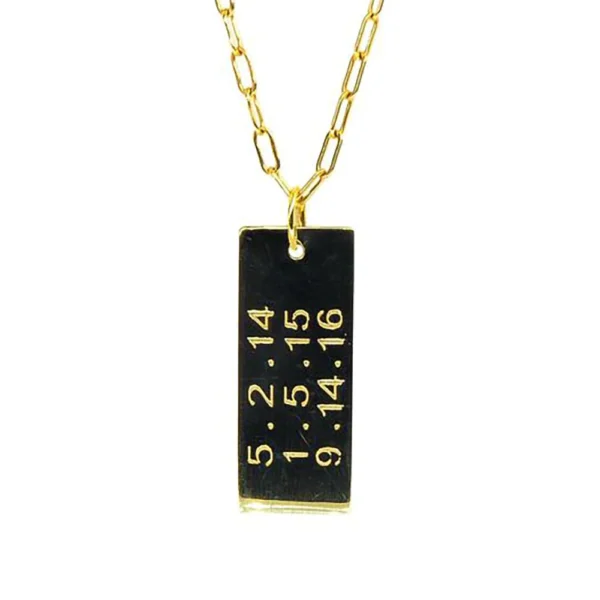 Close to your heart. Commemorate special moments with a personalized, solid gold dog tag necklace engraved with the message or dates of your choice. Rectangular charm with soft corners comes on a delicate, 16″ 14K gold link chain. Choose hand-embossed dates and/or words.