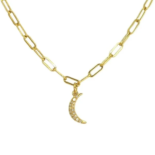Crafted from gleaming 14K gold, this captivating crescent moon necklace embodies the timeless allure of the night sky. Delicate micro-paved diamonds add a touch of dazzling brilliance, making it a truly special piece.