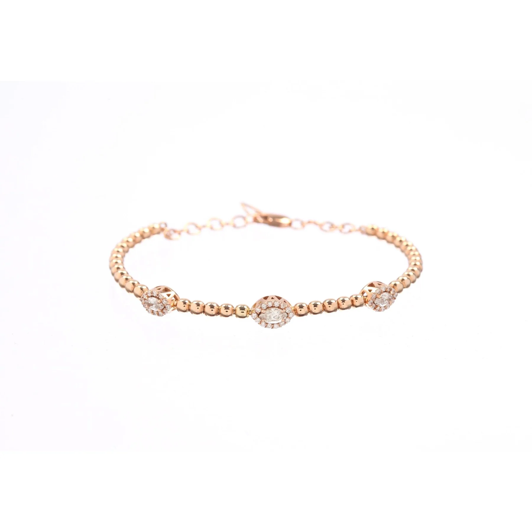 Our Rose Gold Beaded Bracelet is a modern interpretation of a timeless classic. Crafted from high-quality rose gold, it features a delicate beaded design that adds texture and dimension to the piece. The three round diamond clusters spaced evenly along the bracelet add a touch of sparkle and sophistication.