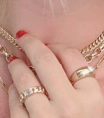 A stylish accessory that exudes elegance and sophistication. Crafted from solid 14K gold and adorned with sparkly baguette diamonds, this trending band is a versatile piece that can be worn alone for a chic look or stacked with other bands to create a personalized collection.