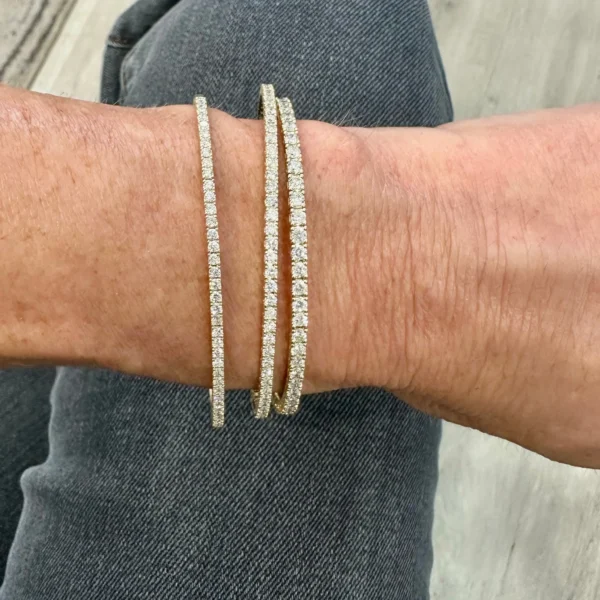 Our 3 carat Diamond Flex Bangle is a timeless piece that exudes elegance and sophistication. With its flexible design it continues to hold its shape and makes it the perfect shaped bracelet to layer with other bangles or chain bracelets. Add this everyday diamond tennis bracelet to your daily collection and it will surely become your new fave! Crafted with precision, it features a delicate band adorned with sparkling diamonds, making it the perfect accessory! Wear it by itself or layer it with any of your favorite bracelets.