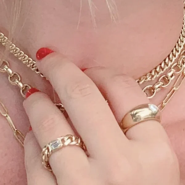Our emerald cut diamond chain link ring has a clean and refined look. Made to wear on any finger of your choice. Ours is set in a handmade bezel within the handmade curb chain. It’s our favorite shaped diamond cut but if you have one of your own or want a different stone you may customize it your way! Please specify your ring size in your order as these are all custom made.
