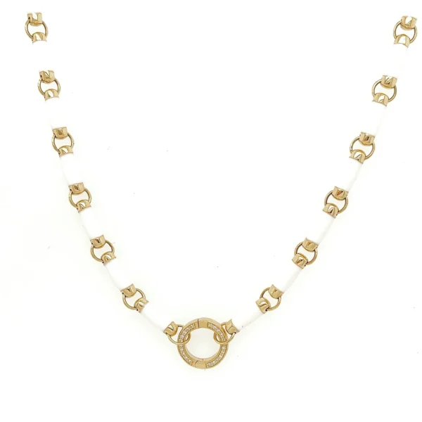 Our 14k gold and white enamel bar link chain will add pop of color to any outfit. Made of 14k solid gold and then layered with white enamel, this necklace will definitely be one of your faves! Adding a diamond round enhancer allows for you to add your favorite pendant.