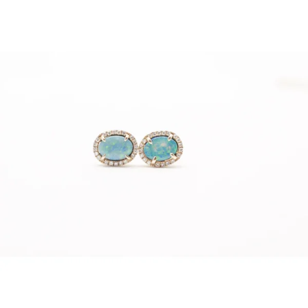 These vintage-inspired opal stud earrings are a classic jewelry choice. The design features cabochon cut fire opals held by a pave diamond and 14K gold prong setting.