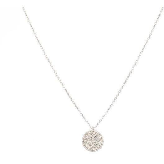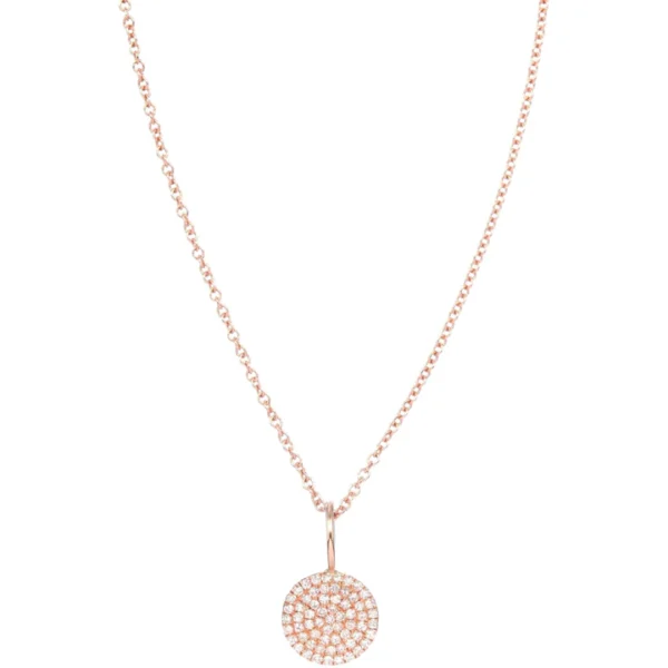 A simply perfect delicate 14K gold circle necklace with a pave round diamond disc with a delicate braided edge. The pave diamond disc hangs on a 14k 18″ gold link necklace with an adjustable ring on 16″.