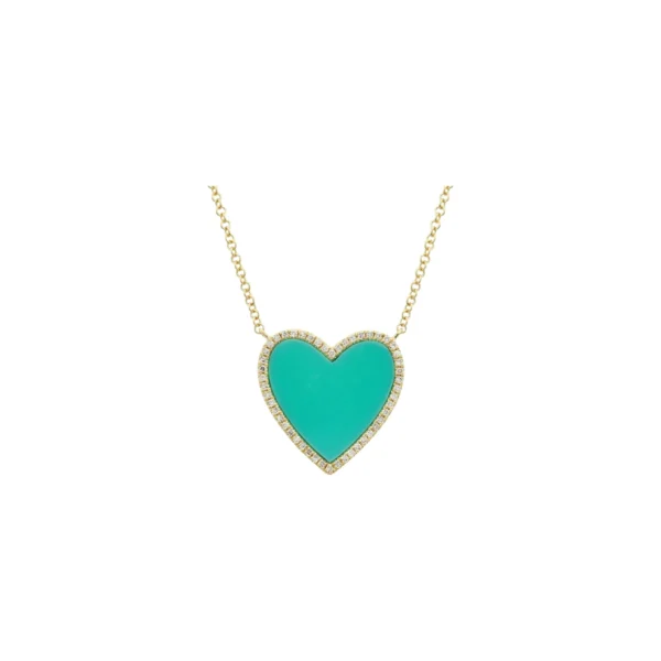 Elevate your jewelry collection with our Turquoise Heart Diamond Pendant, a symbol of timeless elegance and spiritual connection. Handcrafted from premium 14K gold, this necklace features a quality semiprecious turquoise stone surrounded by natural white diamonds, creating a captivating and sophisticated look that transcends trends.