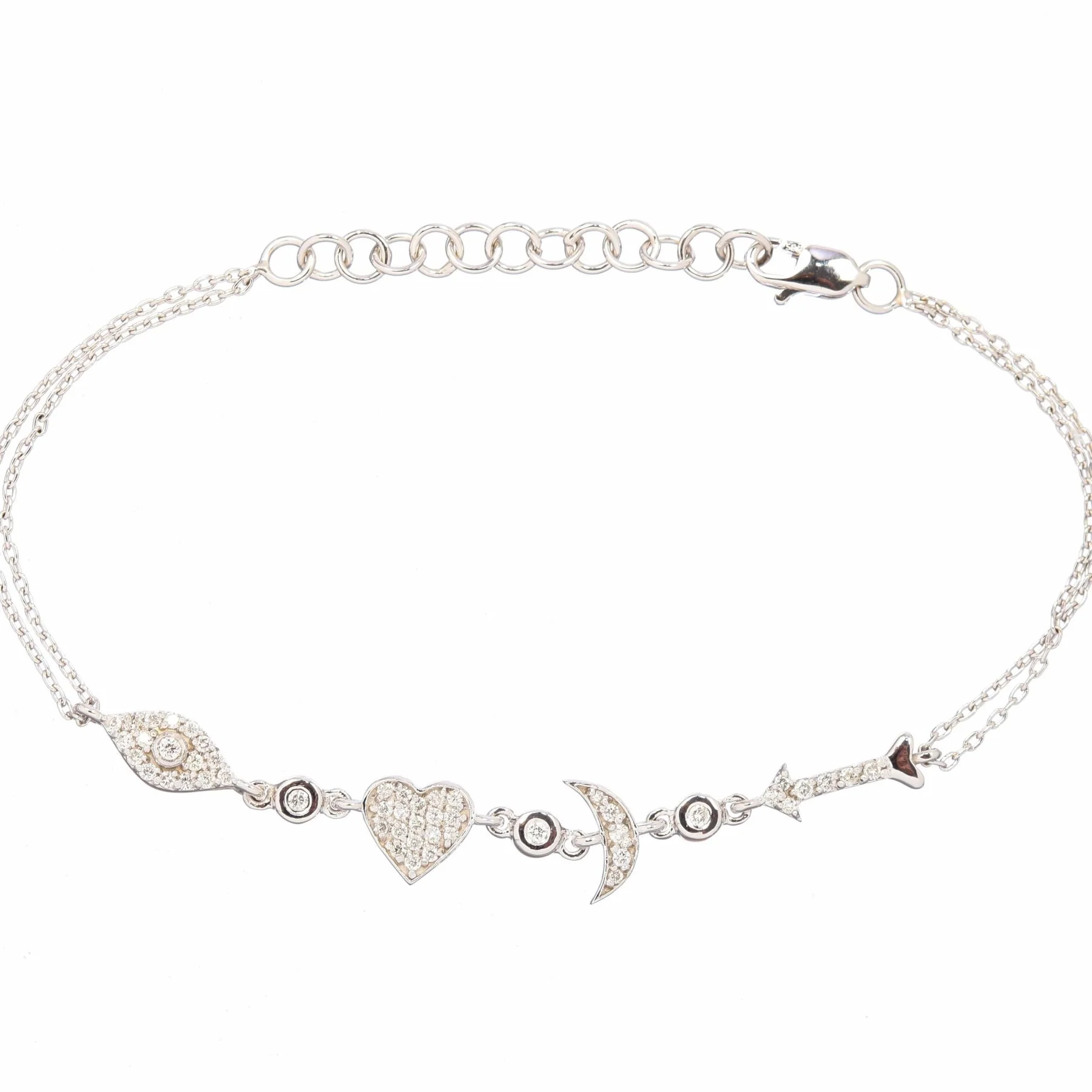 Calling all Wonder Women! This sterling silver bracelet links a circle of love and protection symbols: sapphire accented evil eye, heart, moon and arrow. All in shimmery micro-paved cz’s. Beautiful. Delicate. Meaningful.