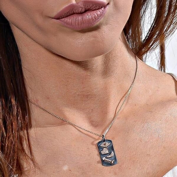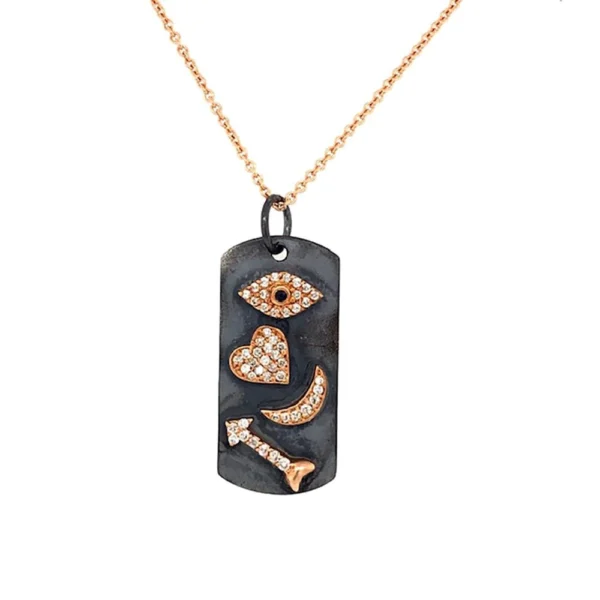 Dog tags were just added to our already loved “ I love you to the Moon and Back “ Collection. Now In oxidized sterling silver with rose gold or yellow gold and pave diamond symbols eye, heart, moon, and arrow.