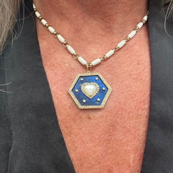 Adorn yourself with this stunning heart pendant! Crafted with lapis, mother of pearl, and diamonds, it’s a show-stopper that will make you stand out. Let this gorgeous piece add a touch of glamour and sophistication to your wardrobe!