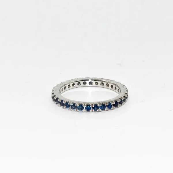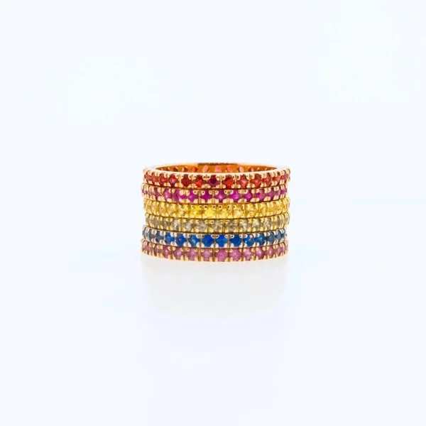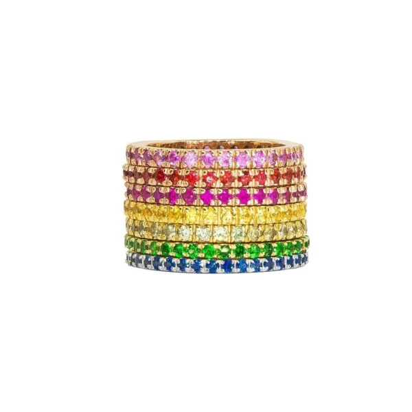 Add a splash of color to your fingers with our multi-gemstone eternity band. Colors have always meant luxury. These contemporary stacking eternity bands have bright sparkling hues that magnify when layered with our other rings. Perfect to wear on any finger.