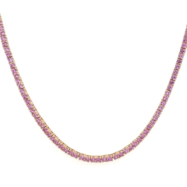 This 14k solid gold pink sapphire tennis necklace is the perfect accessory to add to your wardrobe. Layer it with your other tennis necklaces for a splash of color or any other necklaces for a layered look. This necklace features pink sapphires all the way around and can be worn in multiple ways – 16-18″ length so you can layer it shorter or longer!