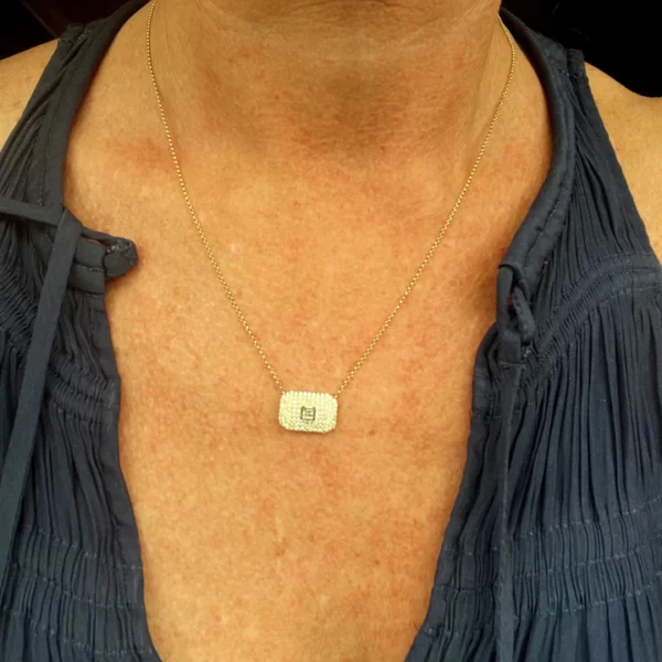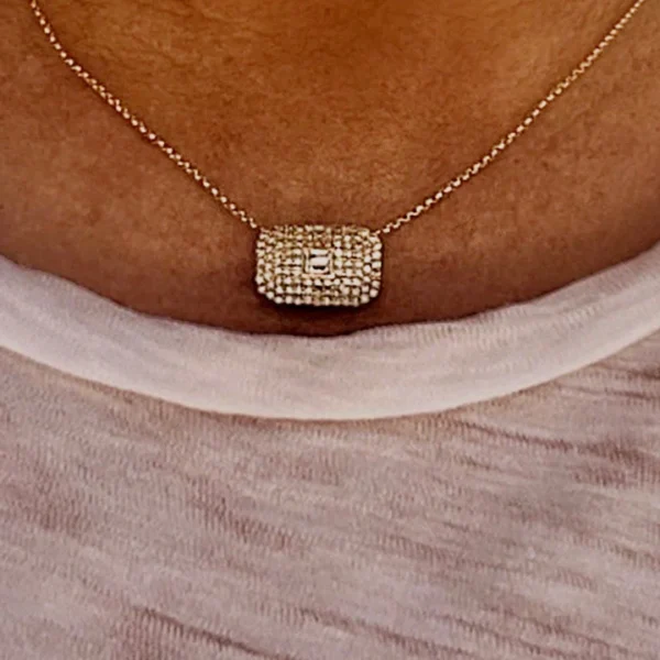 This rectangular pave diamond necklace is the added sparkle you’ve been looking for! There’s no doubt this gorgeous 14k rectangle diamond shaped piece will be a forever classic in your updated wardrobe that makes you feel special and chic.