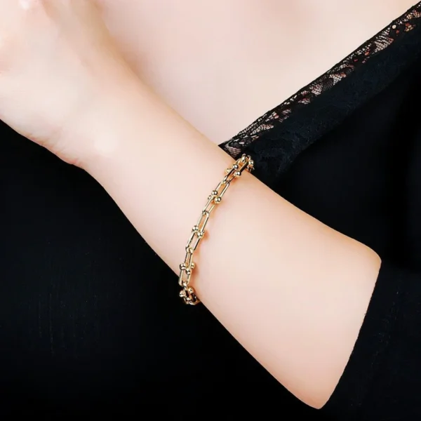 This chunky U link chain is perfect for the modern woman who likes to make a statement with her jewelry. The bold, edgy piece is designed to be worn in multiple ways. Wear it as a necklace or wrap it around your wrist for the perfect statement accessory. The versatility of this piece allows you to mix and match with other pieces in your jewelry collection for endless options and looks.